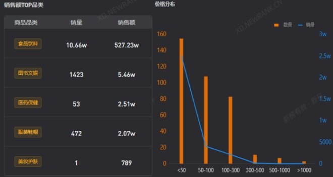 直播貨品方面,截至2月20日,東方甄選共計(jì)售出2.5萬件單價(jià)小于50元的商品;4000余件單價(jià)50至100元區(qū)間的商品;2100余件單價(jià)100至300元區(qū)間的商品;而價(jià)格超過300元的商品銷量約在160件。此外,占據(jù)銷售額前三的商品品類依次為食品飲料、圖書文娛和醫(yī)藥保健。