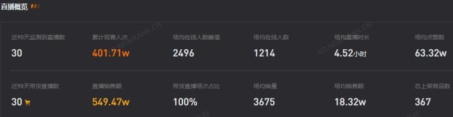 據(jù)新抖數(shù)據(jù)顯示,自2021年12月28日新東方“東方甄選”開始帶貨以來,截至2月20日,該品牌帶貨直播30次,累計(jì)觀看人次401.71萬,累計(jì)直播銷售額549.47萬;場(chǎng)均在線人數(shù)1214、場(chǎng)均直播時(shí)長4.52小時(shí);場(chǎng)均銷量3675件、場(chǎng)均銷售額18.32萬;總上架商品數(shù)367個(gè)。
