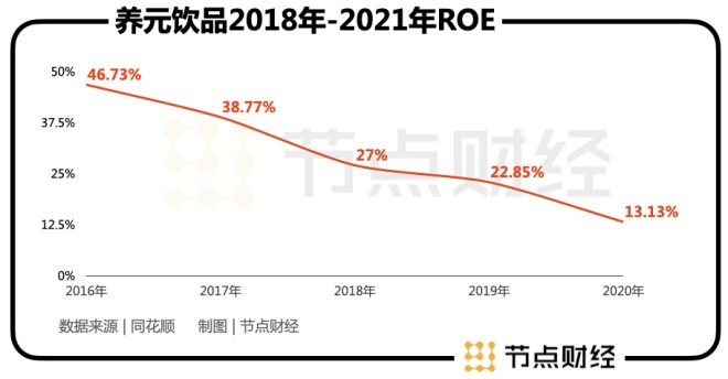 總體比較來(lái)看,養(yǎng)元飲品目前的估值相對(duì)處于行業(yè)中下水平。而從ROE(凈資產(chǎn)收益率)表現(xiàn)來(lái)看,2016年至2020年,其數(shù)值從46.73%逐年下滑至13.13%。相比之下,承德露露同期雖然從未達(dá)到過(guò)30%以上,但一直保持在20%以上,表現(xiàn)更為穩(wěn)健。