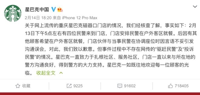 2月13日,有網(wǎng)友發(fā)微博稱,重慶一家星巴克趕走在門(mén)口吃盒飯的民警還惡意投訴。針對(duì)此事,2月14日晚間,星巴克中國(guó)通過(guò)官方微博發(fā)布聲明進(jìn)行致歉。據(jù)星巴克中國(guó)描述,2月13日下午5點(diǎn)左右,有四位民警來(lái)到門(mén)店,門(mén)店安排民警在戶外客區(qū)就餐。后因有其他顧客希望在戶外客區(qū)就餐,門(mén)店伙伴與當(dāng)事民警在協(xié)調(diào)座位時(shí)因言語(yǔ)不妥引發(fā)溝通誤會(huì)。