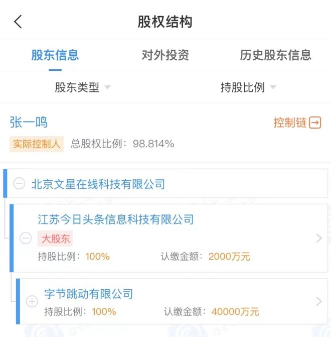 企查查APP顯示,文星在線由江蘇今日頭條信息科技有限公司全資控股,字節(jié)跳動張一鳴為實際控制人。