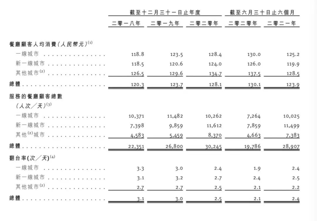 2019年至2021年9月,七欣天也采取了漲價策略,堂食客單價從117元漲到131元,但招股書顯示,翻臺率反而從2.1提升至2.2。