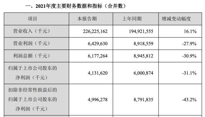 2月22日晚,國內(nèi)糧油領(lǐng)軍企業(yè)金龍魚發(fā)布2021年度業(yè)績快報(bào)。公司預(yù)計(jì)實(shí)現(xiàn)營業(yè)收入2262.3億元,同比增長16.1%,首度破2000億營收大關(guān);凈利潤為41.32億元,同比下降31.1%。值得注意的是,前三季度金龍魚的凈利潤為36.81億元,這個(gè)數(shù)據(jù)意味著,第四季度金龍魚的凈利潤驟降至4.51億元。
