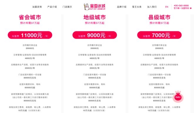 蜜雪冰城官網(wǎng)顯示,縣級(jí)城市、地級(jí)城市、省會(huì)城市每年加盟費(fèi)分別為7000元、9000元和11000元,除了加盟費(fèi)外,開店還有合同履約保證金、品牌管理費(fèi)、門店開設(shè)所需要的設(shè)備等其他費(fèi)用。粗略計(jì)算,加盟一家地級(jí)市蜜雪冰城前期投入費(fèi)用大概在40萬左右。