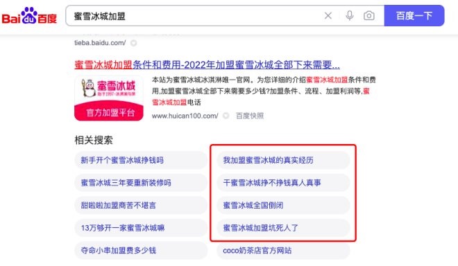 評(píng)論區(qū)清一色的吐槽令人咂舌,而“干蜜雪冰城不掙錢真人真事”、“蜜雪冰城加盟坑死人了”、“我很后悔加盟了蜜雪冰城”等詞條在“相關(guān)搜索”一欄悄然展示也側(cè)面印證了被百度“藏”起來的資訊才是蜜雪冰城加盟的“真相”。