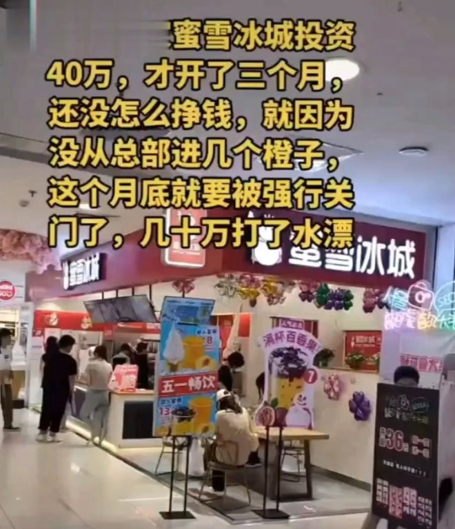 “投資蜜雪冰城40萬,才開了三個(gè)月,還沒怎么掙錢,就因?yàn)闆]從總部進(jìn)幾個(gè)橙子,被強(qiáng)行關(guān)門,幾十萬打了水漂!币晃患用松淘谏缃黄脚_(tái)上表示,不愿從總部進(jìn)原材料與其性價(jià)比不高有關(guān),可一旦加盟商違反規(guī)定,輕則罰錢,重則取消加盟資格。