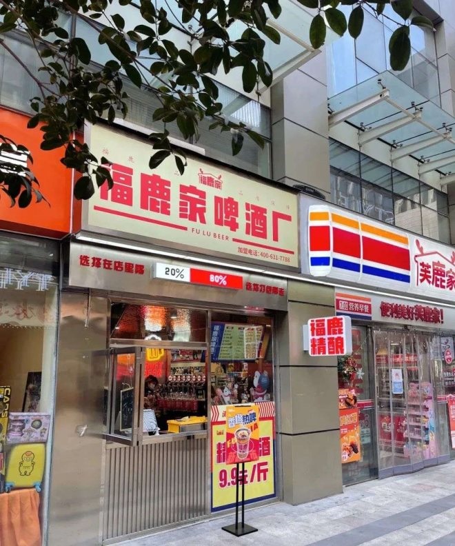 也許在“雪王”的暢想里,小鎮(zhèn)青年的第一杯茶飲“蜜雪冰城”、第一杯現(xiàn)磨咖啡“幸運(yùn)咖”、第一只冰淇淋“極拉圖”、第一杯精釀啤酒“福鹿家”、第一家便利店“芙鹿家”、第一款潮玩“雪王”……
