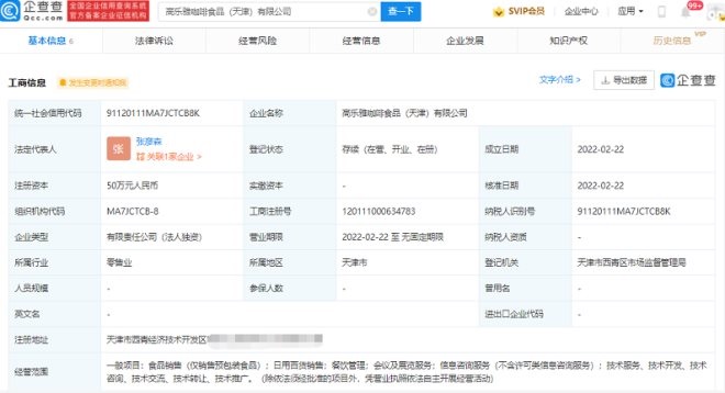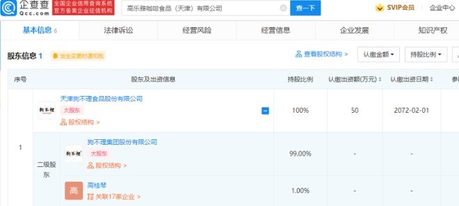 企查查APP顯示,2月22日,高樂(lè)雅咖啡食品(天津)有限公司成立,注冊(cè)資本50萬(wàn)元人民幣,經(jīng)營(yíng)范圍含食品銷售(僅銷售預(yù)包裝食品),餐飲管理等。企查查股權(quán)穿透顯示,該公司由天津狗不理食品股份有限公司全資持股。
