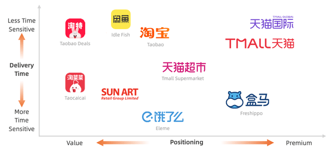 且為了更好的與對(duì)手拼多多和京東競(jìng)爭(zhēng),阿里巴巴為不同的消費(fèi)者創(chuàng)造了一系列產(chǎn)品。不僅有定位于高端消費(fèi)者或價(jià)值消費(fèi)者的平臺(tái),也有更多關(guān)注時(shí)間敏感型交付的平臺(tái)。