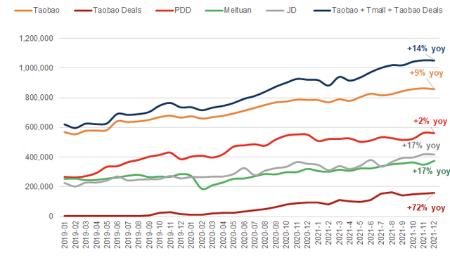 在我看來(lái),阿里巴巴針對(duì)不同用戶群建立不同平臺(tái)的策略似乎效果不錯(cuò),因?yàn)樘詫?天貓+淘寶交易的MAU同比增長(zhǎng)了14%,而拼多多、京東和美團(tuán)的MAU同比分別增長(zhǎng)了2%、17%和17%。