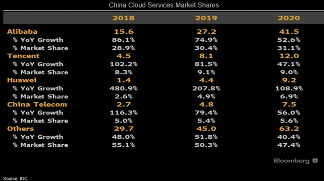 不過(guò),阿里云也有一些競(jìng)爭(zhēng)對(duì)手,如騰訊(OTCPK:TCEHY)、華為和中國(guó)電信(OTCPK:CHJHF)等,盡管他們的基數(shù)較低,但增長(zhǎng)速度快于阿里云,為阿里帶來(lái)了一定的挑戰(zhàn)和威脅。