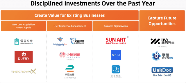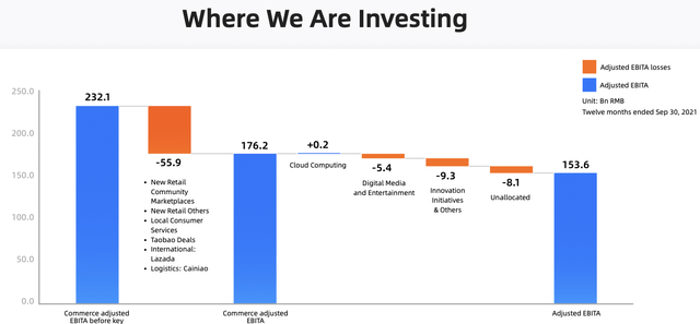 考慮到截至2021年9月阿里巴巴的現(xiàn)金和現(xiàn)金等價(jià)物為680億美元,2021財(cái)年產(chǎn)生的非GAAP自由現(xiàn)金流為260億美元,該公司有足夠的現(xiàn)金來(lái)收購(gòu)協(xié)同業(yè)務(wù)或新業(yè)務(wù)。如下圖所示,隨著阿里巴巴在投資中展現(xiàn)出紀(jì)律性,它現(xiàn)在更清楚自己在過(guò)去一年中是如何部署的。