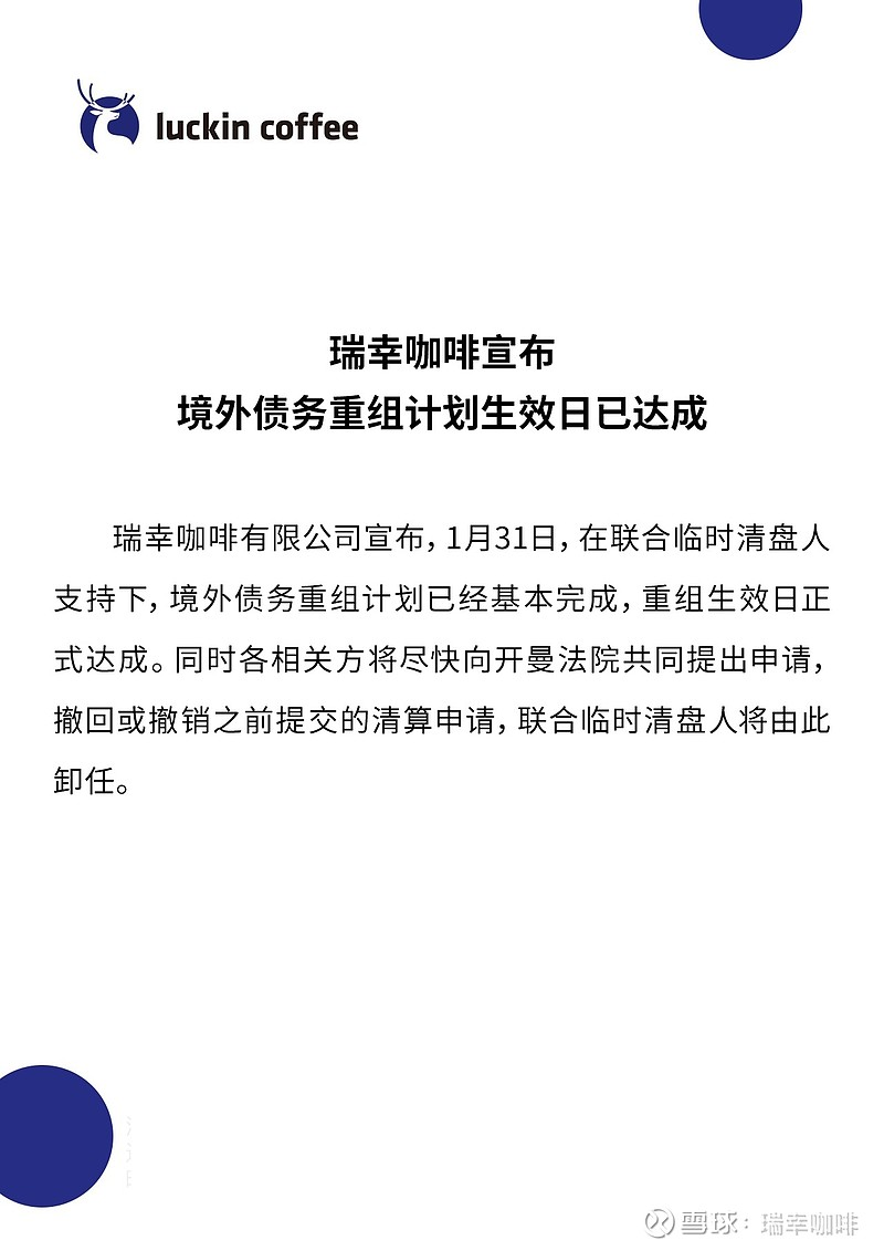 今年1月31日,瑞幸發(fā)布公告,宣布債務(wù)重組計(jì)劃基本完成,同時(shí),各方希望在合理可行的情況下,盡快以協(xié)商一致的方式向開曼法院申請(qǐng)撤銷清盤呈請(qǐng),從而解除聯(lián)合臨時(shí)清盤人的委任。
