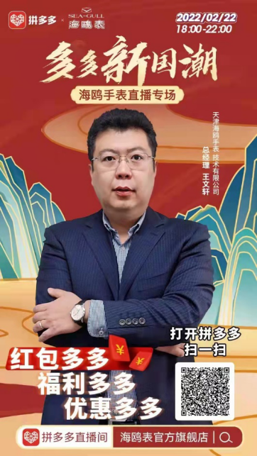 “《長津湖》授權(quán)的聯(lián)名款非常有紀(jì)念意義,全球限量僅有1950塊。”2月22日,新電商拼多多聯(lián)合海鷗手表,把直播間搬進(jìn)了海鷗在天津的總部和博物館,共同開啟了一場“多多新國潮”直播專場活動,助力國產(chǎn)老字號品牌直連新消費。