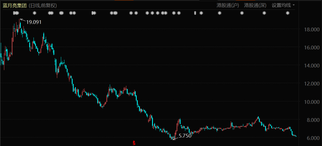 2021年1月沖高達到98.46倍后,如今藍月亮回歸到38倍市盈率,而價值回歸的過程,伴隨著藍月亮股價的一路跳水,從最高的19.091港元,暴跌到最低5.75港元。