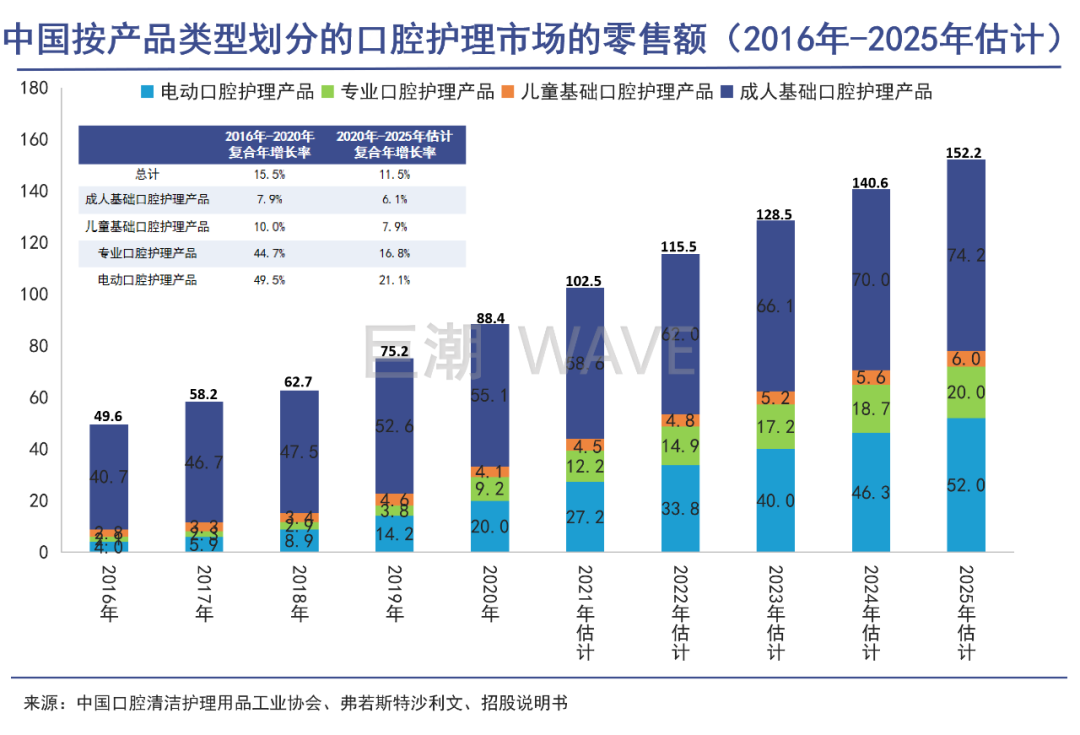 弗若斯特沙利文數(shù)據(jù)顯示,2020年中國口腔護理市場零售額達到884億元,2025年預(yù)計達到1522億元。