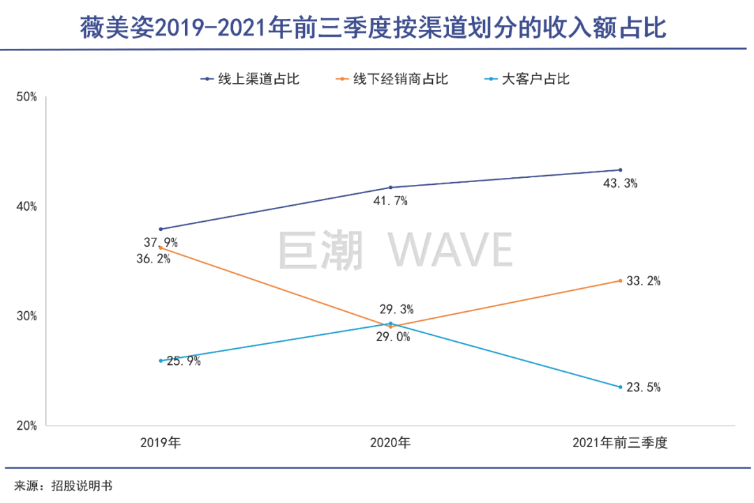 “宅經(jīng)濟”的有利環(huán)境下,選擇在線上營銷上瘋狂砸錢,薇美姿押對了寶。招股書的數(shù)據(jù)顯示,2019年、2020年薇美姿線上渠道營收分別為6.3億元、6.7億元,占比分別為37.9%、41.7%,而線下及大客戶渠道的占比則為62.1%和58.3%。