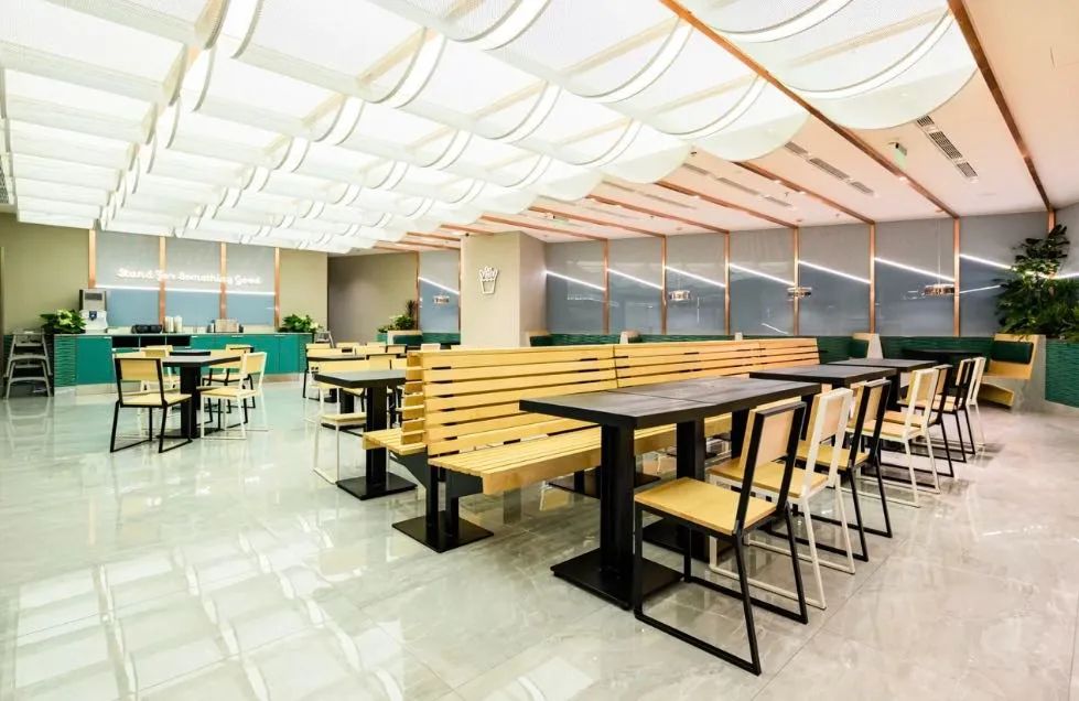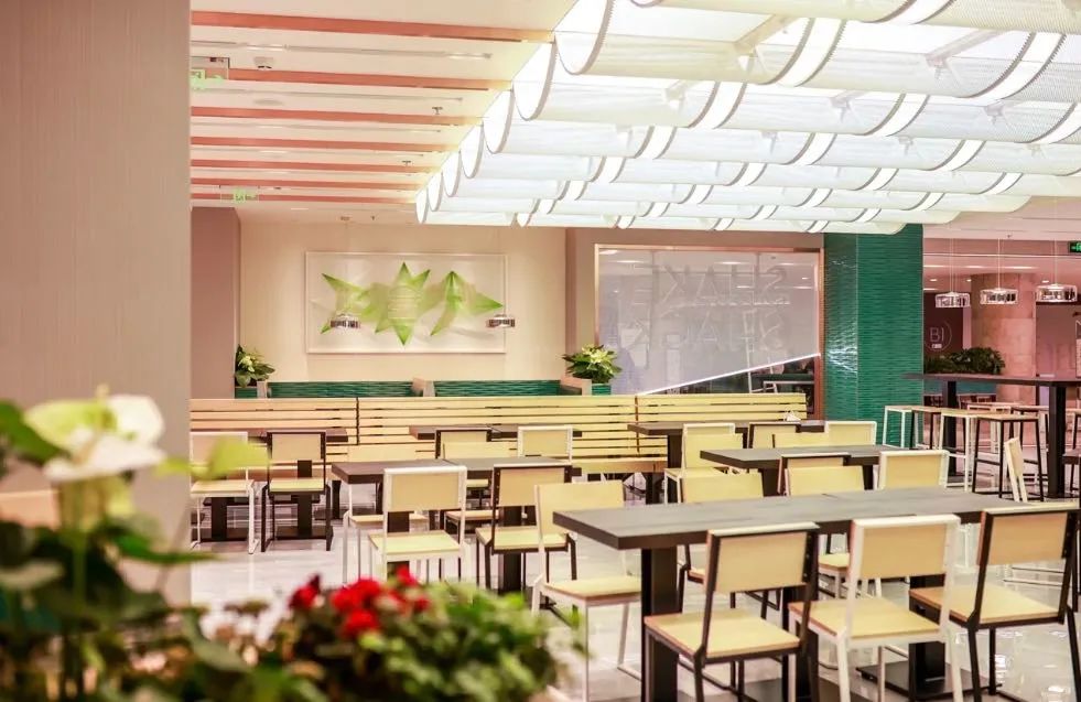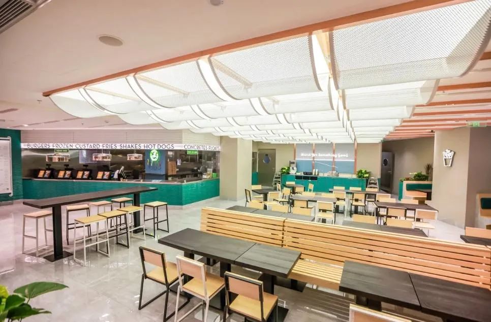 江蘇首店的裝修風(fēng)格延續(xù)了Shake Shack一直以來(lái)的店鋪風(fēng)格,依然是以綠色作為自己的主題顏色;桌椅方面選擇了黑色餐桌配以木制椅子;在就餐區(qū)域更是鋪設(shè)了一整面頂棚的燈帶,微微泛暖的光源再讓人感到溫暖的同時(shí)也會(huì)食欲大開(kāi)。