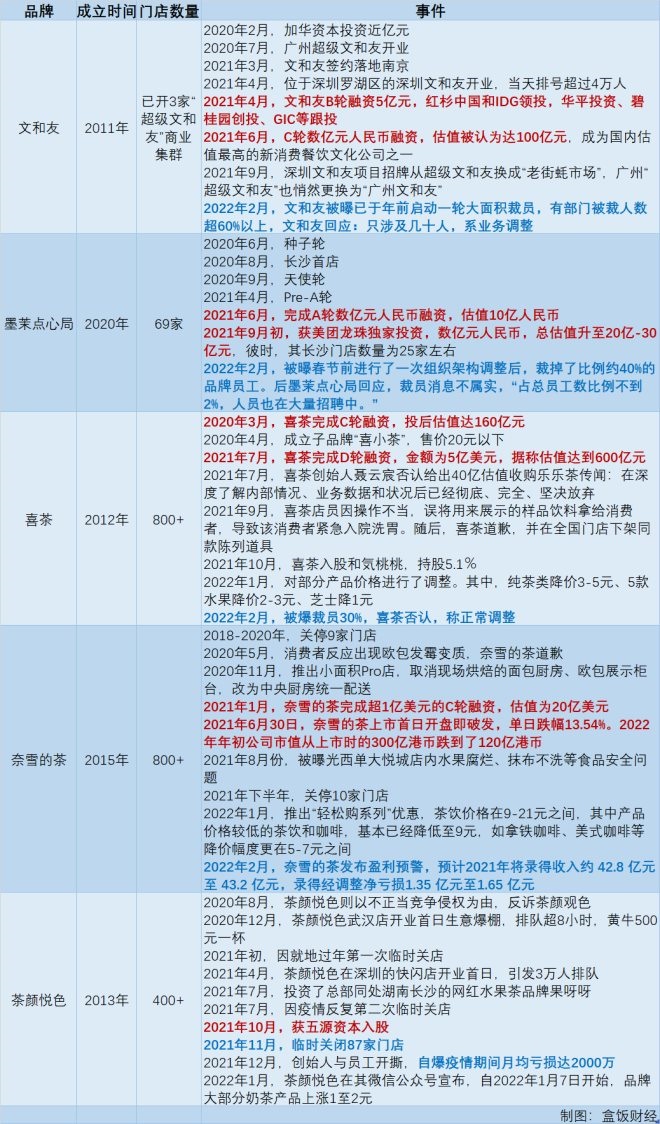 更早之前,新消費(fèi)賽道中,部分網(wǎng)紅品牌已現(xiàn)頹勢(shì):喜茶部分產(chǎn)品降價(jià)后,被曝裁員30%;茶顏悅色高管與員工群內(nèi)開撕,自曝疫情期間月均虧損2000萬(wàn),而在此之前已經(jīng)臨時(shí)關(guān)閉87家門店;已經(jīng)上市的奈雪的茶,日子也不好過(guò),2021年下半年就關(guān)停了10家門店。