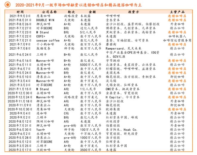 據(jù)深圳晚報(bào)報(bào)道:2021年8月,資本對(duì)于咖啡領(lǐng)域的融資"熱情高漲",一個(gè)月時(shí)間內(nèi),咖啡領(lǐng)域就發(fā)生了三輪融資,SEESAW咖啡宣布完成過(guò)億元A+輪融資;M Stand咖啡獲得超5億元B輪融資;時(shí)萃咖啡宣布完成近億元新一輪融資。此外,2021年該賽道已發(fā)生約21起融資事件,融資總額超46億元。