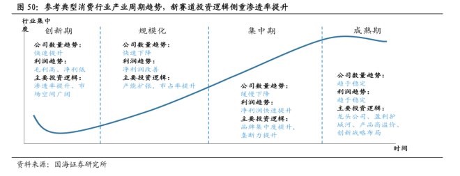 國(guó)海證券研究所認(rèn)為,創(chuàng)新期更適用于賽道布局戰(zhàn)略,邏輯來(lái)源于新品野蠻生長(zhǎng),滲透率快速提升,進(jìn)而拔高該賽道的估值。當(dāng)賽道進(jìn)入規(guī)模化階段,行業(yè)空間和格局已經(jīng)初步形成,更應(yīng)關(guān)注公司打法,卓越的公司品牌集中度與市占率提升,擠壓落后公司出局,即公司邏輯大于賽道邏輯。