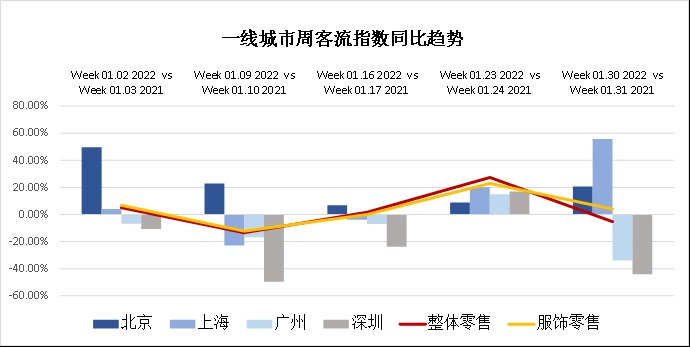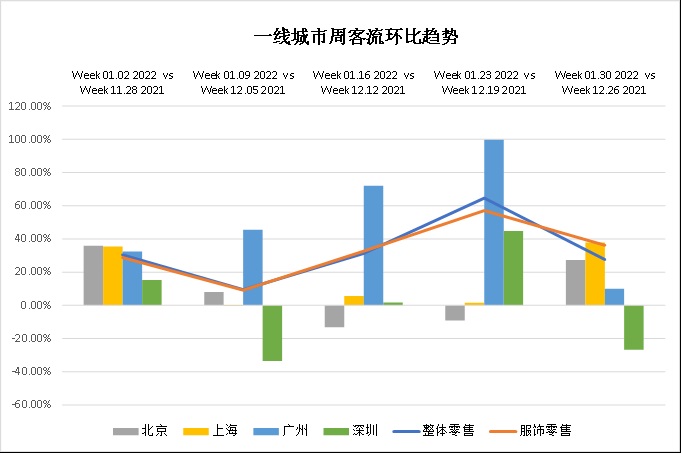 與2021年12月份相比,由于新年的臨近,大大刺激和拉動(dòng)了1月的線(xiàn)下客流量,圖中可以看出,1月份的周客流環(huán)比整體表現(xiàn)優(yōu)異,均有不同程度的增長(zhǎng)。