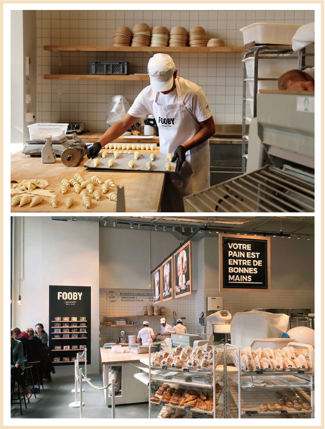 咖啡與烘焙分別位于主入口的兩側(cè)。顧客剛一進(jìn)店,就被倍煎咖啡的香氣與新鮮出爐的面包的味道包圍,窗邊設(shè)有座位,可作為堂食區(qū)使用。從玻璃窗也可看到面包師傅手工制作各種烘焙食品,如羊角面包、酸面包、法式長棍面包等。面粉使用當(dāng)?shù)孛姘?Moulin d'Echallens的有機(jī)面粉,咖啡的糖漿也來自當(dāng)?shù)厥称飞蘈a Suisserie和Jardin des Monts。