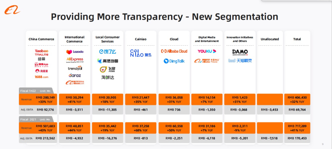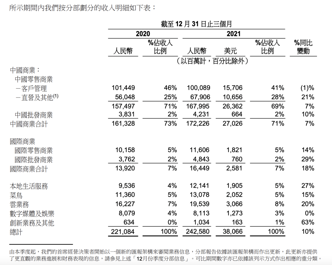 這季財報中,阿里將商業(yè)分部進一步拆分為「中國商業(yè)」、「國際商業(yè)」、「本地生活服務」、「菜鳥」四個部分,投資者能夠清晰看到每個業(yè)務單元的表現(xiàn)。