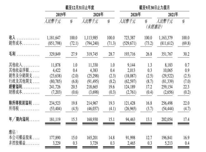 而根據(jù)招股書(shū),2019年、2020年及2021年前九個(gè)月,楊國(guó)福收入分別達(dá)到11.82億元、11.14億元和11.63億元,同期利潤(rùn)分別達(dá)到1.81億元、1.69億元和2.02億元;同期毛利率為分別為27.9%、28.7%和30.2%。
