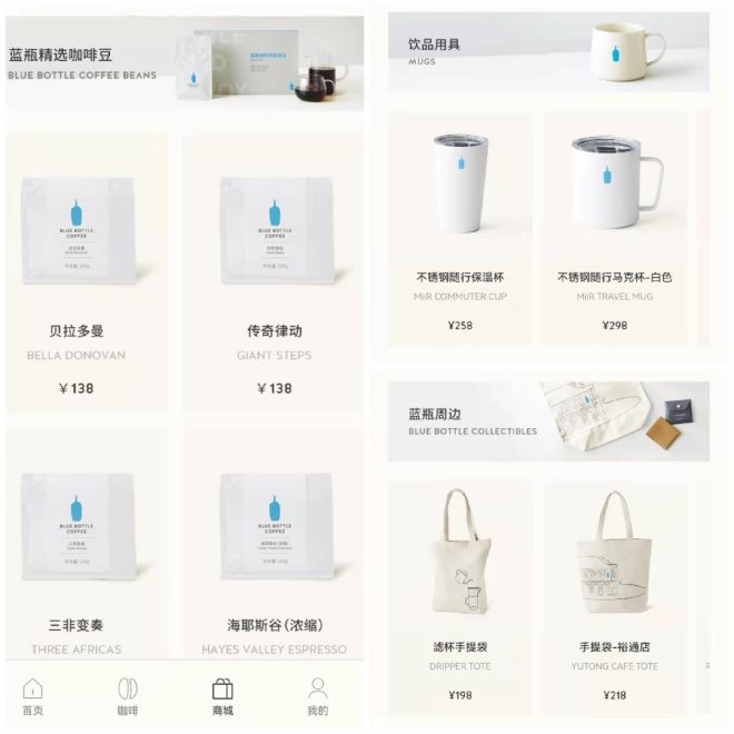 目前店內(nèi)所能喝到的咖啡豆及周邊產(chǎn)品,也已經(jīng)同步在藍(lán)瓶咖啡微信官方商城上線。