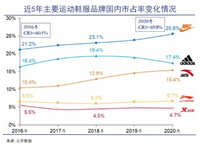 截至2020年,耐克(25.6%)、阿迪達(dá)斯(17.4%)兩家的市占率就達(dá)到43%,且主要占據(jù)中高端市場(chǎng)。再加上國(guó)內(nèi)李寧、安踏兩家企業(yè)“得隴望蜀”,留給其他小品牌的空氣越來(lái)越稀薄。