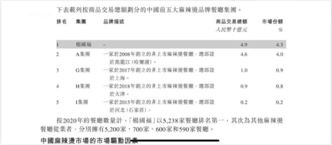 中式快餐市場高度分散,弗若斯特沙利文數(shù)據(jù)顯示,2020年前五大公司市占僅2.9%。按交易總額和餐廳數(shù)量計算,楊國福以49億元,5238家餐廳,排名第一,后四位分別是張亮麻辣燙、老鄉(xiāng)雞、鄉(xiāng)村基及李先生牛肉面。