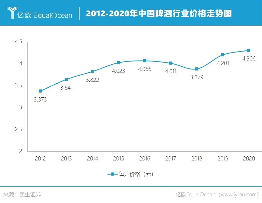 民生證券數(shù)據(jù)顯示,2012年國產(chǎn)啤酒價位為3.37元/L;在2015年每升價格突破4元大關,2019年和2020年每升價位分別為4.2元和4.3元。
