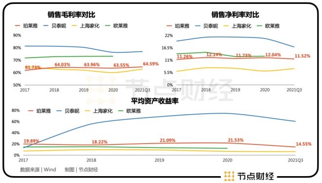 ROE方面,珀萊雅處于龍頭中間水平,好于上海家化與歐萊雅,但與貝泰妮差距明顯。這也難怪,市場(chǎng)給了貝泰妮行業(yè)最高的估值。故而珀萊雅能不能有更高的估值,在成長(zhǎng)性的能力以外,也要格外關(guān)注其毛利率、ROE的變化。