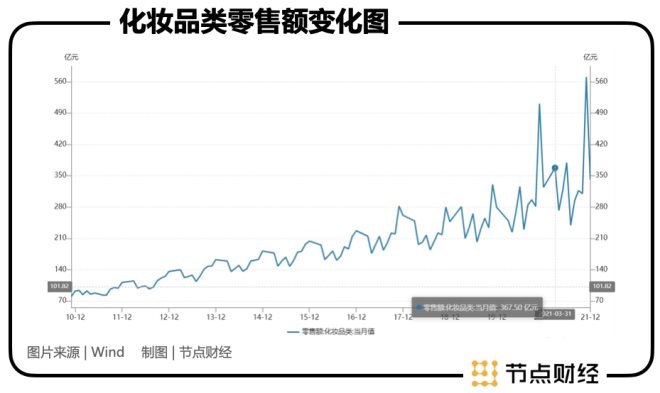 首先,受到“顏值經(jīng)濟(jì)”的影響。當(dāng)下很多人對(duì)顏值的追求已經(jīng)近乎瘋狂,“顏值即正義”的論調(diào)層出不窮。為化妝品市場(chǎng)催生了極大的空間。從近十余年的化妝品零售額變化可見(jiàn)一斑,趨勢(shì)持續(xù)上升,2010年11月零售額為80億左右,而2021年11月零售額則為570億左右。