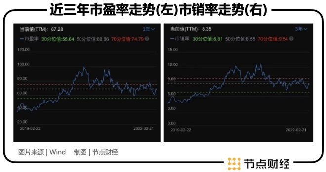 縱向來(lái)看,無(wú)論是市盈率還是市銷(xiāo)率,珀萊雅似乎都處在相對(duì)高位上。