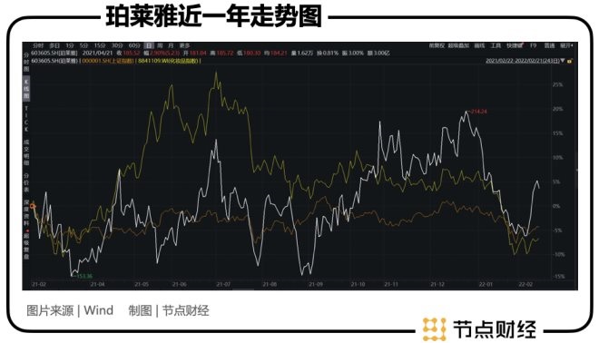 作為A股化妝品龍頭之一,珀萊雅的資本市場(chǎng)成績(jī)單可謂是可圈可點(diǎn)。2017年11月上市至今,從21.57到幾月前最高點(diǎn)214.24,幾乎翻了十倍。雖然近一年的走勢(shì)也十分曲折,但大體趨勢(shì)是好于大盤(pán)與行業(yè)指數(shù)的。