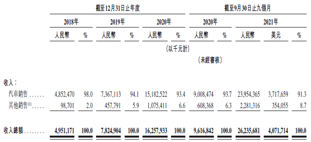 而隨著交付量的增加,蔚來的營收也逐年遞增。招股書顯示,蔚來2018年、2019年、2020年及2021年前9個月的營收,分別為49.51億元、78.25億元、162.58億元和262.36億元。