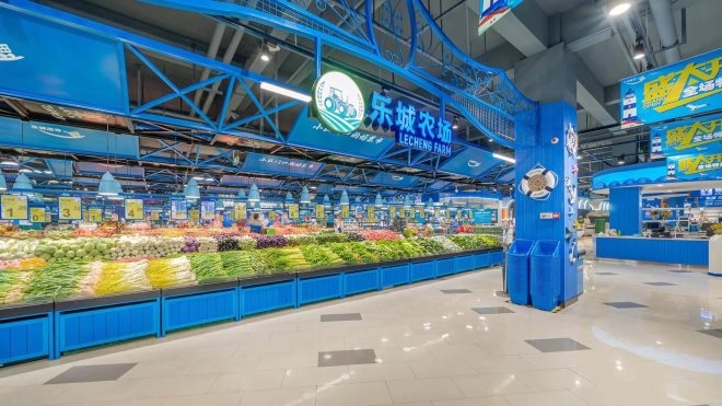 后現(xiàn)代工業(yè)風(fēng)+地中海藍(lán)色風(fēng)格設(shè)計(jì)讓門店充滿力量感、趣味、清新、詩(shī)意、凈爽、極具視覺(jué)沖擊力。敞開(kāi)式、階梯式超長(zhǎng)生鮮貨架層層遞進(jìn),讓商品大鋪面依次展開(kāi),不僅僅豐富了商品陳列,同時(shí)也便于顧客選購(gòu)。柱體鏡面處理拓寬了門店空間感。在肉類、魚(yú)類、干雜等區(qū)域從柜體貨架到專區(qū)特陳在地中海風(fēng)格的渲染下彰顯魅力。店內(nèi)超大面積電子屏渲染環(huán)境,讓門店更具科技感、現(xiàn)代感。