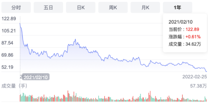 財(cái)報(bào)公布次日,金龍魚早盤低開之后迅速殺跌,盤中一度下跌超9%。截至最近一個(gè)交易日收盤,金龍魚股價(jià)報(bào)收于54.45元,總市值為2952億元。較股價(jià)最高時(shí)的市值已經(jīng)跌去6成之多。