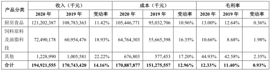 盡管有著縱向一體化布局和產(chǎn)業(yè)鏈深加工能力,金龍魚整體盈利能力卻并不突出,2020年綜合毛利率僅為12.33%。其中,廚房食品板毛利率為13%,飼料原料及油脂科技毛利率為10.66%。