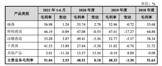 2018年至2021年上半年,公司主營(yíng)業(yè)務(wù)毛利率分別為51.63%、48.33%、48.51%和 51.04%,長(zhǎng)期達(dá)50%左右。其中,又以碗燕毛利率最高,報(bào)告期內(nèi)分別為53.68%、52.96%、55.74%和56.98%。