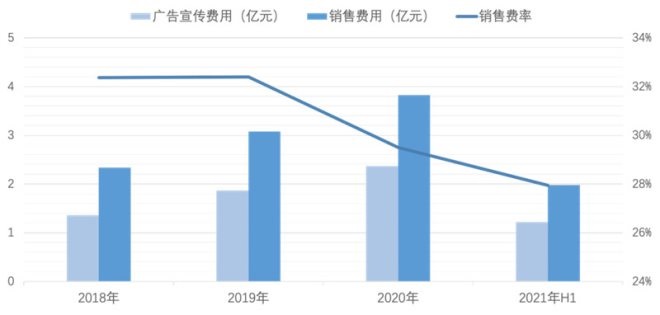 實(shí)際上,市場(chǎng)對(duì)燕之屋營(yíng)銷(xiāo)費(fèi)用過(guò)高的質(zhì)疑從未間斷。2018年至2021年上半年,燕之屋銷(xiāo)售費(fèi)用2.34億元、3.08億元、3.83億和1.98億元,銷(xiāo)售費(fèi)率常年維持在30%左右。這其中,同期廣告宣傳費(fèi)用達(dá)1.36億元、1.87億元、2.37億元和1.22億元。