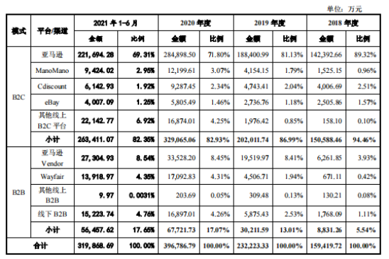 招股書顯示,截止報告期,亞馬遜平臺銷售收入分別占比93.25%、89.54%、80.25%和77.85%。其中,B2B模式在亞馬遜平臺收入占比為3.93%、8.41%、8.45%、8.54%,呈逐年上漲趨勢。