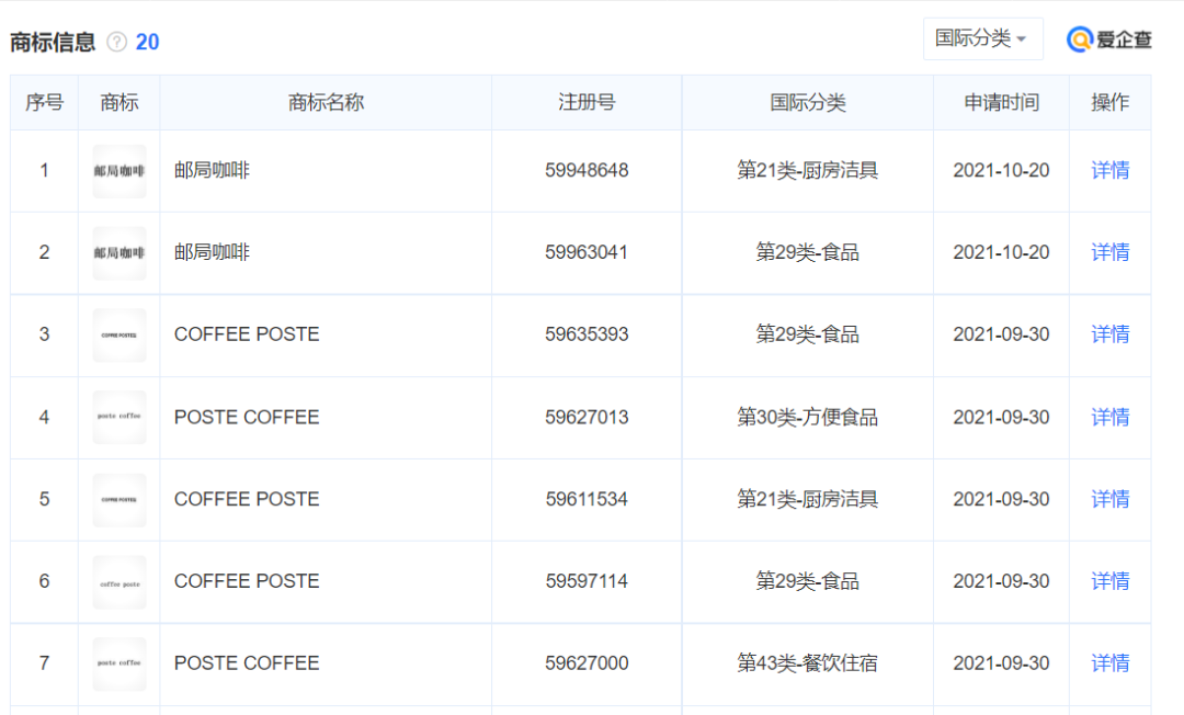 通過愛企查公開的工商信息,“中域咖燁”的全稱為“上海中域咖燁管理咨詢有限公司”,是一家關(guān)于咖啡品牌運(yùn)營和咖啡連鎖經(jīng)營的管理咨詢公司,于2021年9月成立,并于2021年9月、10月,申請注冊郵局咖啡相關(guān)商標(biāo),包含“郵局咖啡”“COFFEE POSTE”等商標(biāo),涉國際分類食品等。2021年11月22日,該公司廈門分公司成立。