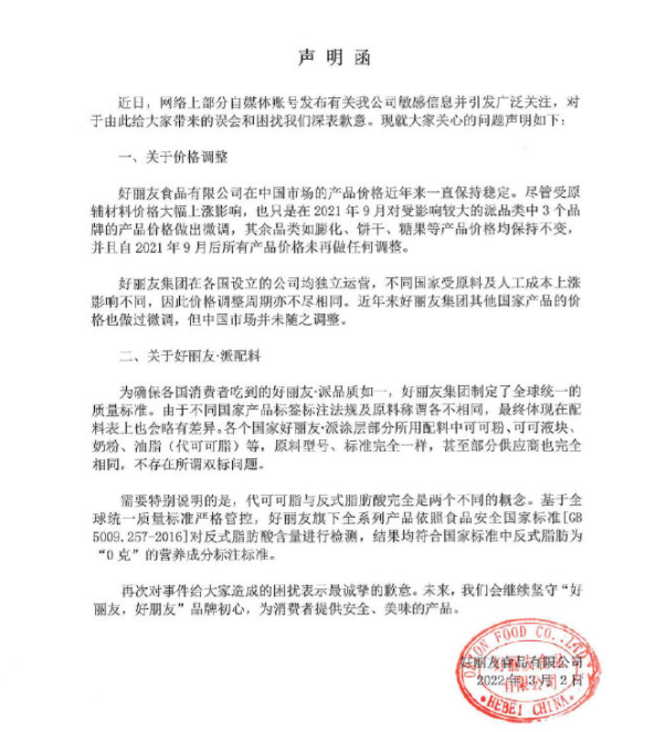 好麗友再發(fā)致歉聲明,回應(yīng)漲價(jià)和配料問題