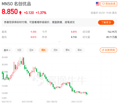 截至2022年3月1日收盤,名創(chuàng)優(yōu)品股價報8.85美元/股,總市值27.12億美元,比之2020年10月15日上市首日名創(chuàng)優(yōu)品20.88美元/股的發(fā)行價,跌幅超過五成。