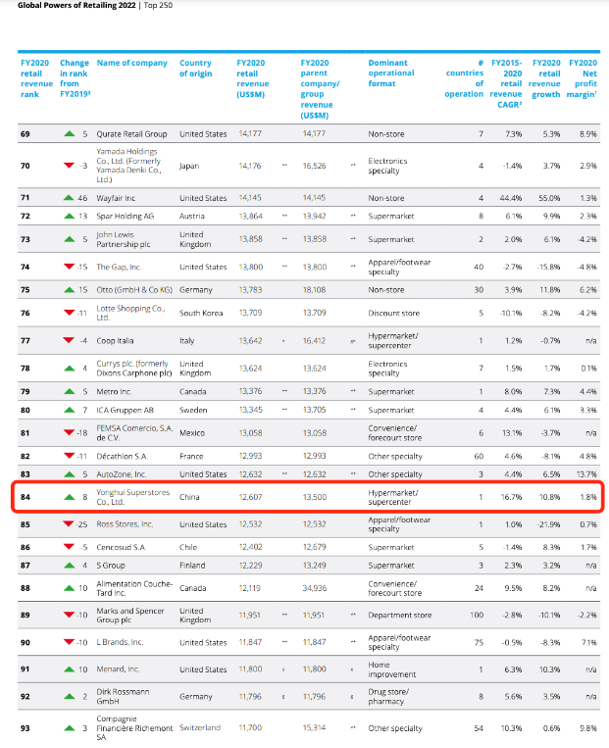 聯(lián)商快訊:近日,德勤發(fā)布最新研究報(bào)告《2022全球零售力量》。據(jù)報(bào)告顯示,永輝入圍全球零售250強(qiáng)榜單,名列第84位,較去年上升8位。