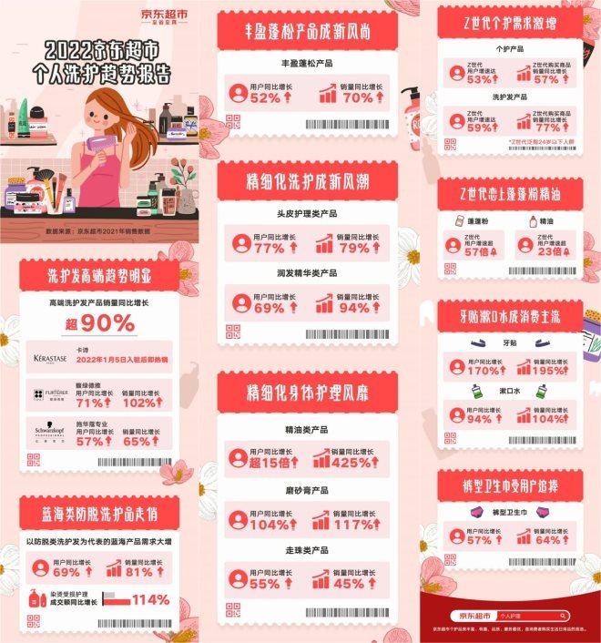 2月28日,京東超市發(fā)布的《2022個人洗護趨勢報告》顯示,洗護發(fā)行業(yè)呈現(xiàn)高端化、功能型兩大發(fā)展趨勢,其中高端洗護發(fā)產(chǎn)品銷量同比增長超90%,防脫功效洗護發(fā)產(chǎn)品銷量增長超80%。