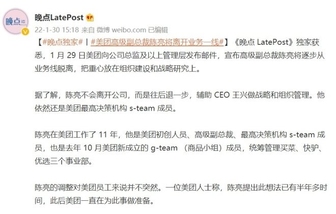 值得關(guān)注的是,據(jù)《晚點(diǎn)LatePost》報(bào)道,2022年1月29日,美團(tuán)向公司總監(jiān)及以上管理層發(fā)布郵件,宣布高級副總裁陳亮將逐步從業(yè)務(wù)線脫離,把重心放在組織建設(shè)和戰(zhàn)略研究上。報(bào)道稱,陳亮不會離開公司,而是輔助CEO王興做戰(zhàn)略和組織管理,他依然還是美團(tuán)最高決策機(jī)構(gòu)s-team成員。一位美團(tuán)人士稱,陳亮提出此想法已有半年多時(shí)間,此后美團(tuán)一直在為此事做準(zhǔn)備。